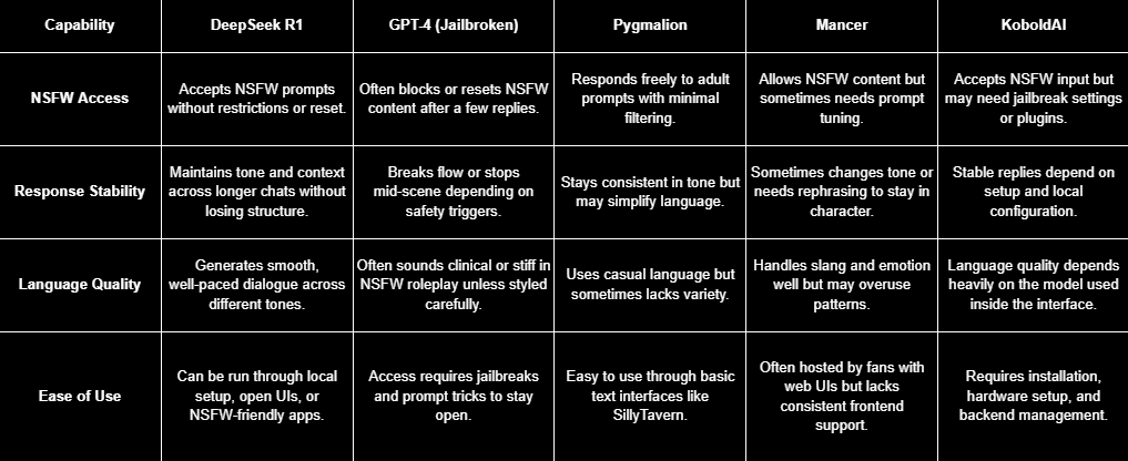 DeepSeek R1 is ideal for users who want full control, smooth writing, and fewer barriers to adult storytelling, especially when compared to more restricted or complex alternatives.