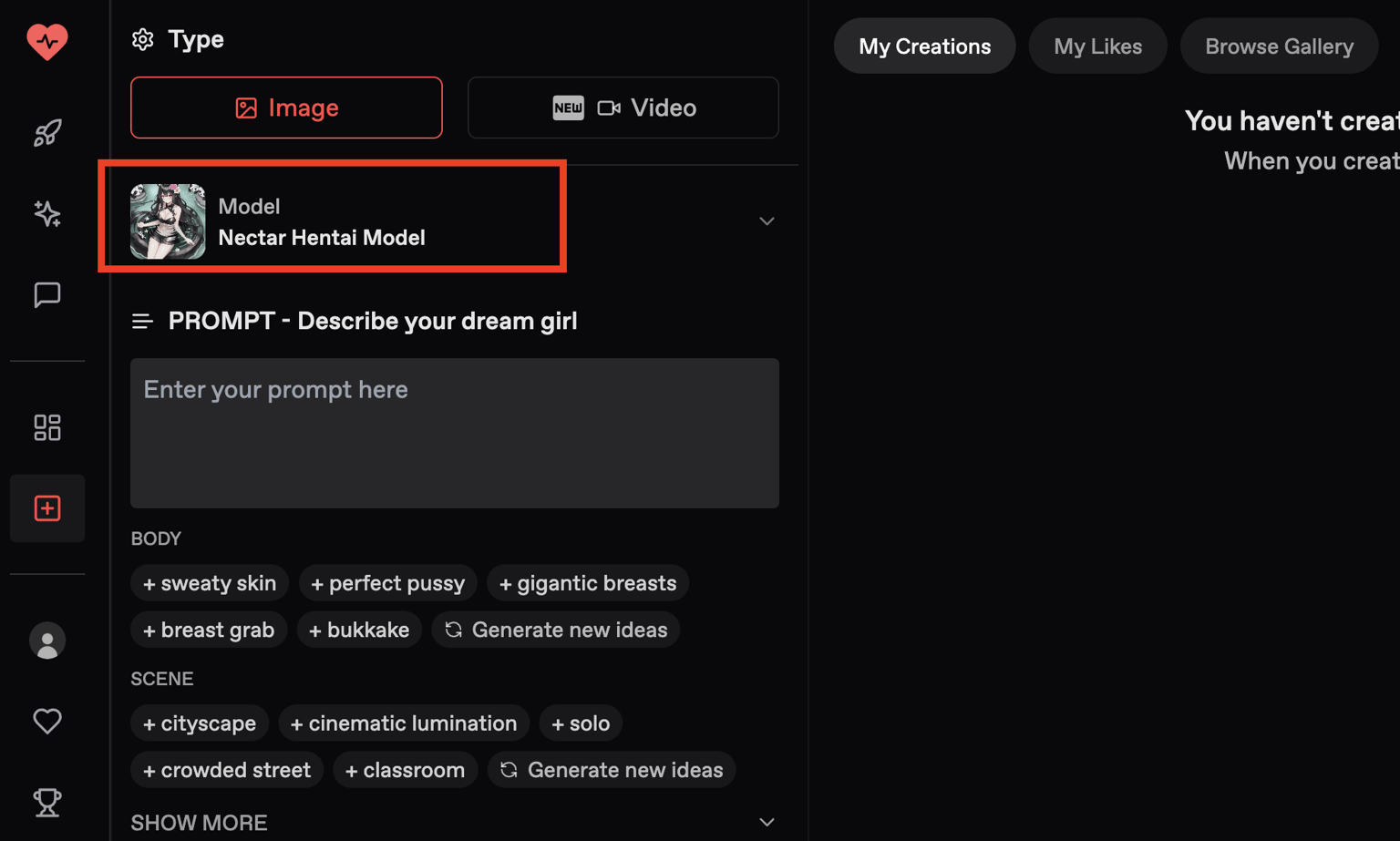 Next, describe the image you want in the prompt field. Nectar gives you a lot of constimization controls on the final result of the character. Below the promot field, you can also specify various other parameters like the scene, the face, outfit, and even describe her icks.