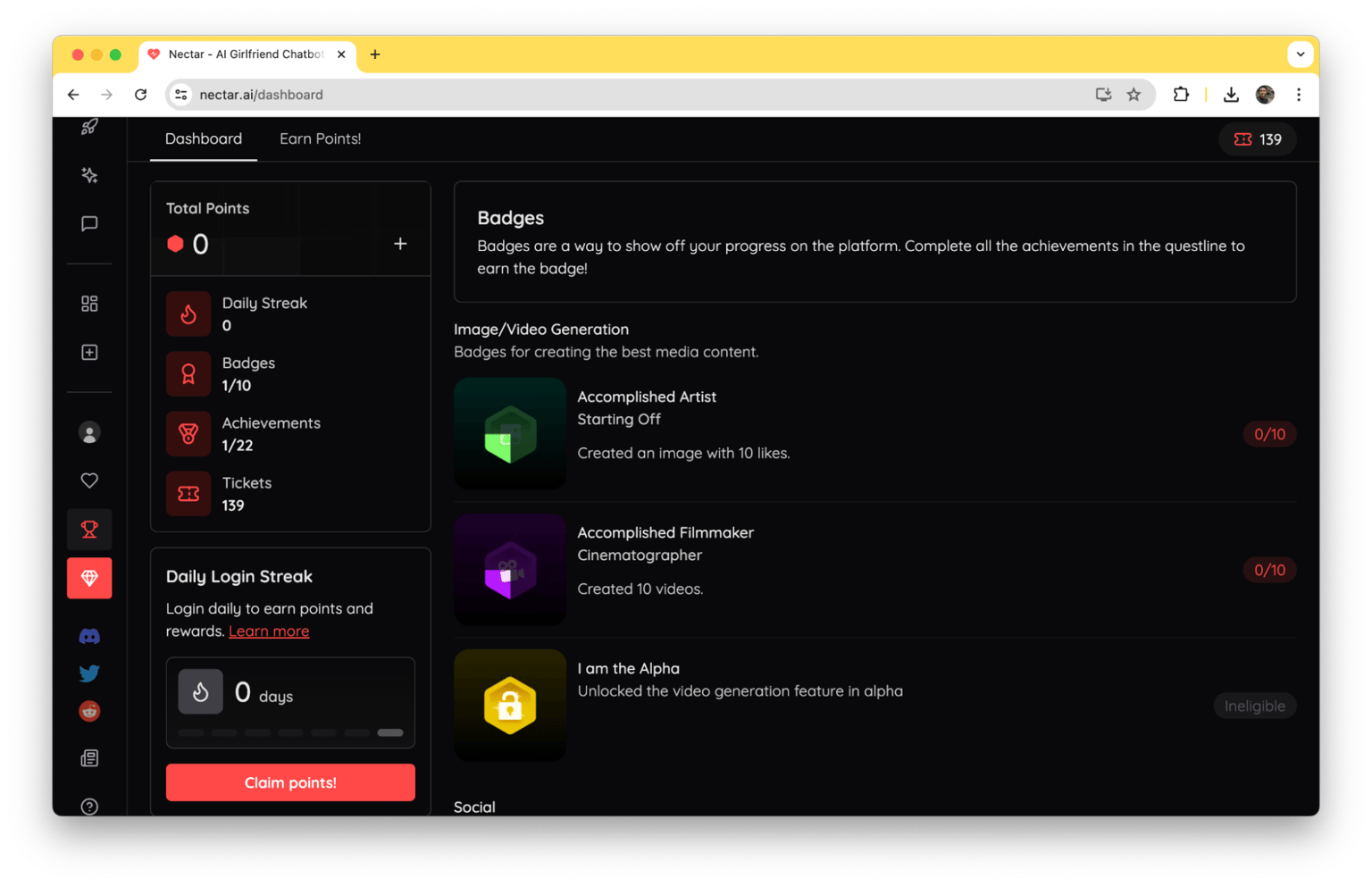 Points can unlock exclusive features and future perks, while badges, earned by completing challenges in categories like Image/Video and Roleplay/Fantasy, can be proudly displayed on your public profile, showcasing your journey and accomplishments.