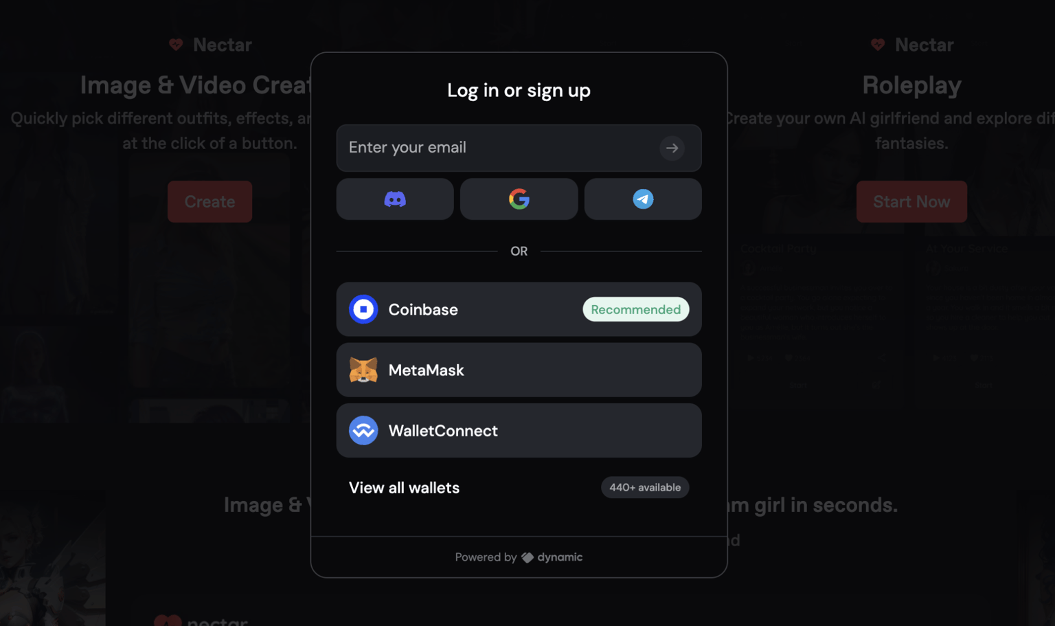 Go to Nectar AI and create an account for free. You can create an account with either an email address, Google, Discord, or Telegram, or you can use a crypto wallet to login.