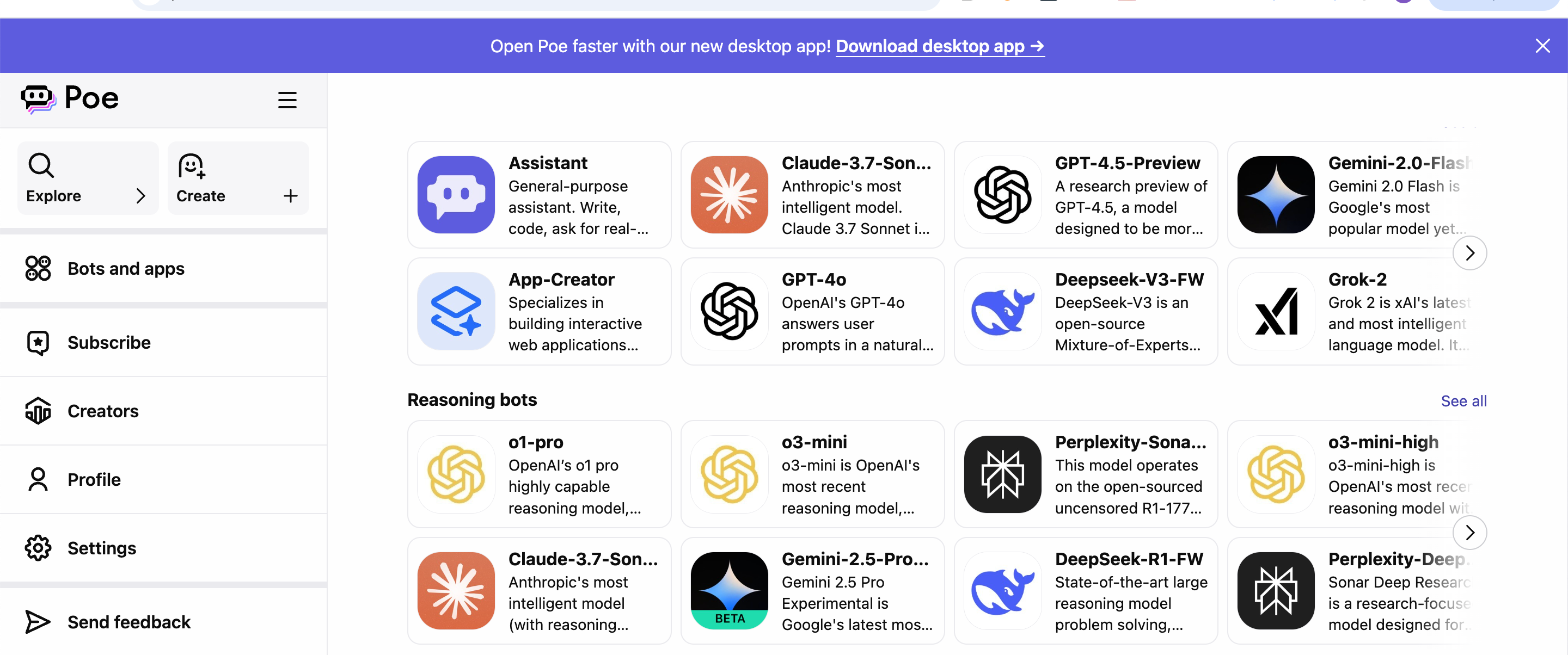 Poe, short for “Platform for Open Exploration,” is an AI chatbot interface developed by Quora. The platform's main value proposition is allowing users to chat with multiple AI models — including ChatGPT, Claude, Llama, and others — in a single, unified platform.