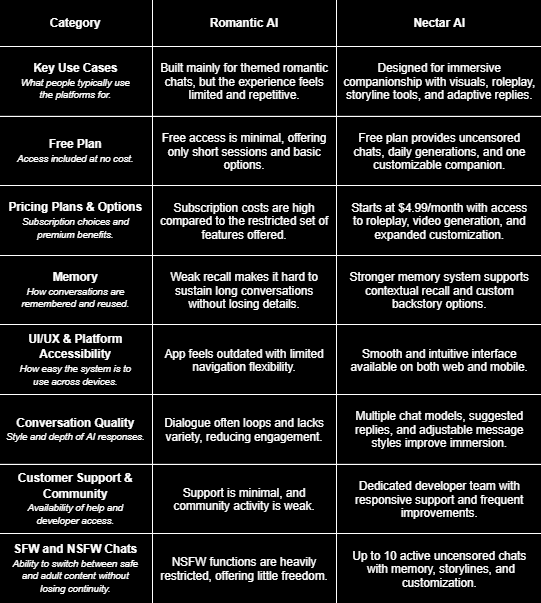 The comparison table below outlines how Romantic AI and Nectar AI differ in terms of features, plans, and conversation performance.