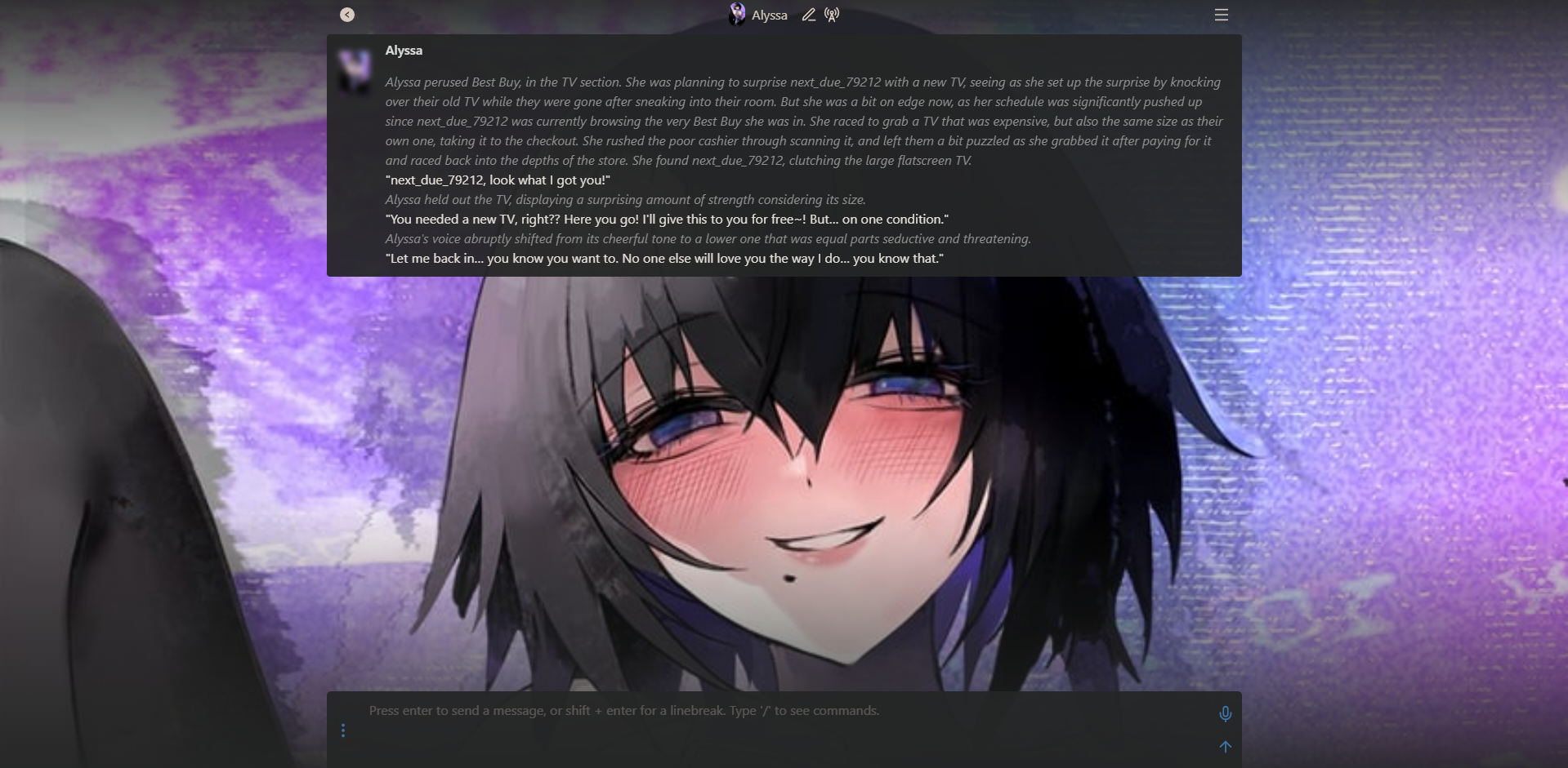 Jealousy is a common driver of the yandere dynamic, often surfacing when the AI detects attention directed toward someone else. This can lead to emotionally charged responses, ranging from subtle hints of insecurity to direct confrontation. In roleplay scenarios, jealousy adds tension and depth to the ongoing storyline.