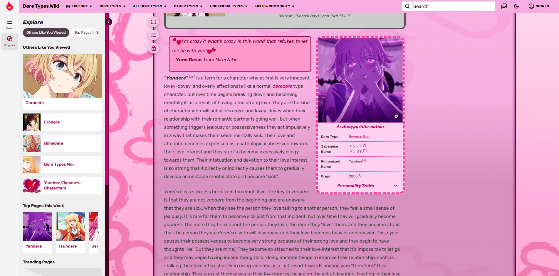 The term "yandere" comes from Japanese pop culture, combining the words yanderu (mentally or emotionally ill) and deredere (affectionate or loving). It describes characters who start as sweet and loving but become intensely possessive, sometimes to the point of obsession. In fictional works, this mix of tenderness and extreme devotion creates high-stakes emotional tension that appeals to certain audiences.