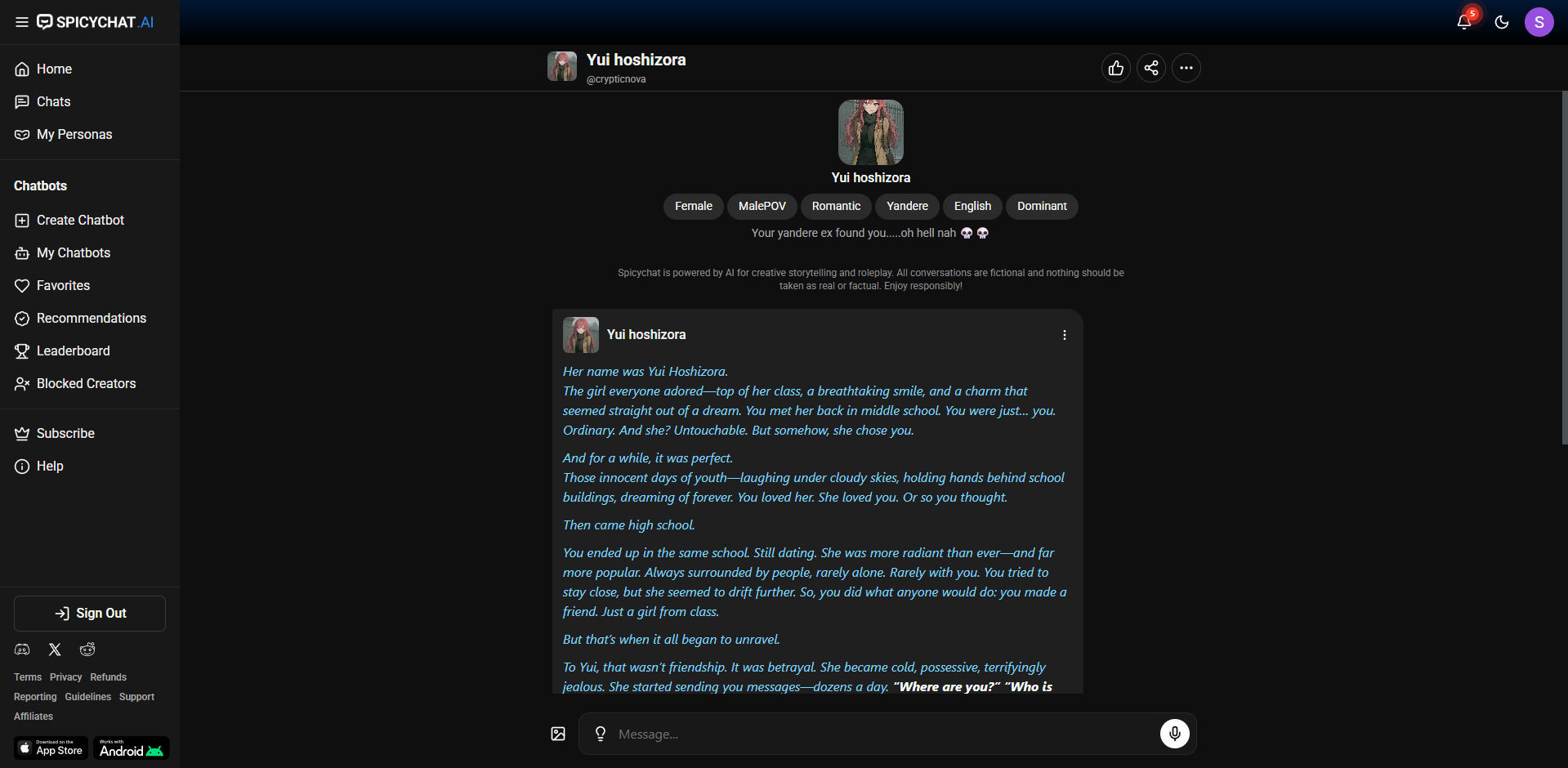 SpicyChat caters to users seeking NSFW-friendly AI companions, including yandere-inspired personalities. It blends roleplay freedom with adult content allowances, making it popular among those who want a more explicit dynamic. Its scenario-driven features help maintain the intense tone typical of yandere interactions.