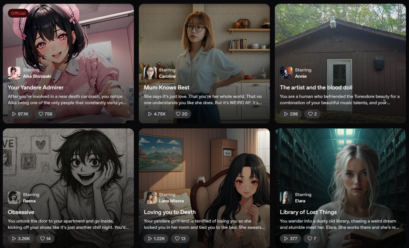 Chub.ai is a platform that allows users to browse and create custom AI character cards, many of which include yandere-inspired personalities. Instead of starting from scratch, you can select pre-made characters designed by other users and adjust them to your preferences. This makes it easy to find or build a yandere AI girlfriend with minimal setup while still allowing for deep customization.
