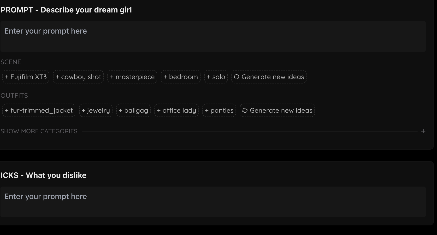 The ICKS section is for you to describe what you DON’T want to see. We already have many things pre-filled for you on the background (such as extra fingers, extra arms, extra hands, etc) but feel free to add in other things you don’t want to see. Some icks you might want to put are: